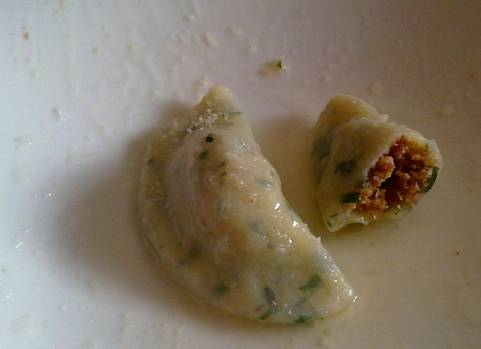 Per quanto riguarda l’impasto, si inizia lessando le patate. Per questo genere di preparazione, devono esser bollite necessariamente con la buccia, o assorbono troppa acqua. Sono cotte quando si possono infilzare con una forchetta senza fare resistenza. Una volta cotte, sbucciatele e schiacciatele subito con uno schiacciapatate, se aspettate che raffreddino avrete un impasto granuloso. Se non l’avete, usate una forchetta o un setaccio e mai un frullatore o un passaverdura: diventerebbero un impiastro colloso. I più pigri, tra cui il sottoscritto, non pelano le patate, ma le tagliano a metà e le schiacciano con la parte affettata appoggiata ai fori dello schiacciapatate; la buccia non passa. Aggiungete la farina e l’uovo e lavorate con le mani fino ad ottenere un impasto uniforme e morbido, dopo di che incorporate il prezzemolo. Dividete l’impasto in tre o quattro palle, infarinatele esternamente e lasciatele riposare per alcuni minuti, nel frattempo infarinate leggermente anche il piano di lavoro. Stendete una parte dell’impasto con un mattarello in un foglio uniforme alto un paio di millimetri. Aiutandovi con un bicchiere o uno strumento simile, dividete l’impasto in dischetti larghi circa sei centimentri. Per formare un cjalson, si prende un cucchiaino di ripieno e gli si dà una forma ovale e si stacca con un coltello un dischetto di pasta dal piano di lavoro. Si mette la pallina di ripieno al centro del dischetto (meglio dal lato che era poggiato al tavolo, che sarà più umido) e si richiude benissimo a mezzaluna, cercando di evitare bolle d’aria. Può essere necessario inumidire con dell’acqua il bordo interno per farlo aderire perfettamente. Questa operazione va ripetuta finché l’impasto o il ripieno non sono terminati: questo momento coinciderà solo se siete stati molto fortunati. Vi raccomando di recuperare e reimpastare i ritagli che rimangono dalla preparazione dei dischetti, altimenti la pasta non basterà.