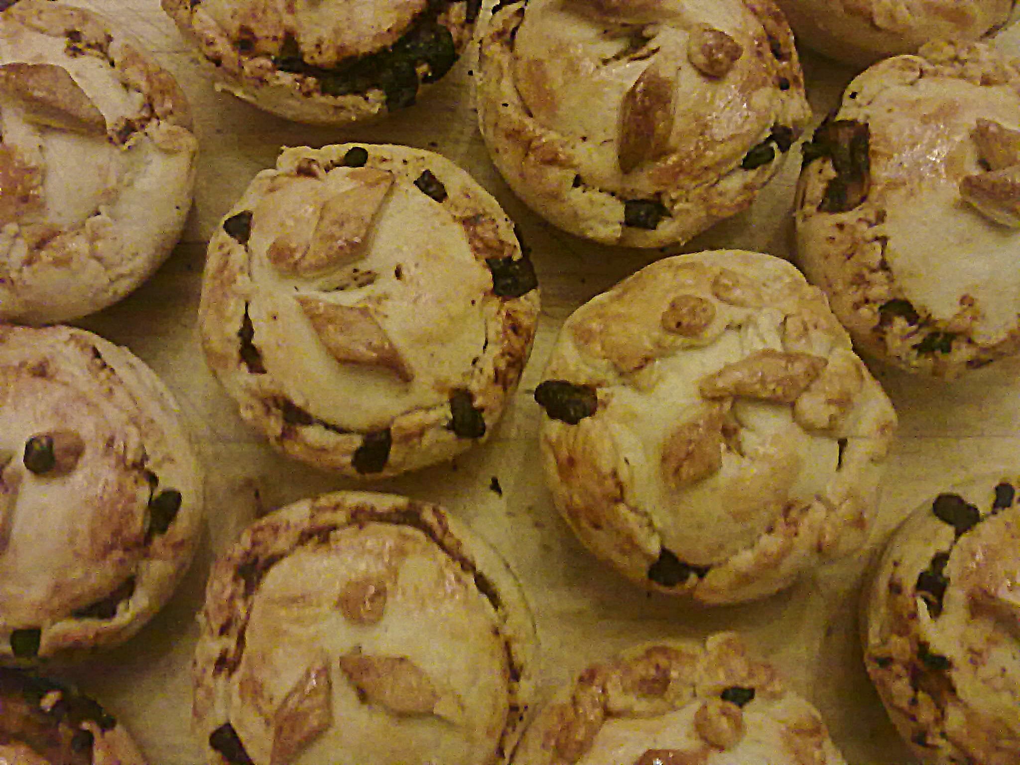 La pasta va poi stesa con un mattarello in uno strato di circa tre millimetri e usata per foderare degli stampi per tortini o muffin sul fondo e le pareti. Si riempie ciascuno di questi fin quasi all’orlo con il ripieno e si stende su ciascun pasticcio un altro strato di pasta, che andrà a fare da coperchio. Cercate poi di unire bene i bordi premendoli insieme con le dita.
