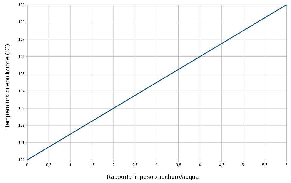 dove ΔTb e la variazione della temperatura di ebollizione rispetto al solvente puro (l’acqua bolle a 100 °C, se non lo sapeste), Kb è una proprietà del solvente che si chiama “costante ebullioscopica” (0,512 K·kg·mol^-1 per l’acqua), i è il “coefficiente di van ‘t Hoff” del soluto, che descrive in quanti pezzettini si divide la molecola quando va in soluzione (1, per lo zucchero), n è il peso molare del soluto (0,342 kg·mol^-1 per lo zucchero) e m è la massa. Con questi dati, si può fare questo bel grafico teorico di come aumenta la temperatura di ebollizione di una soluzione di zucchero in acqua mano a mano che diventa più concentrata.