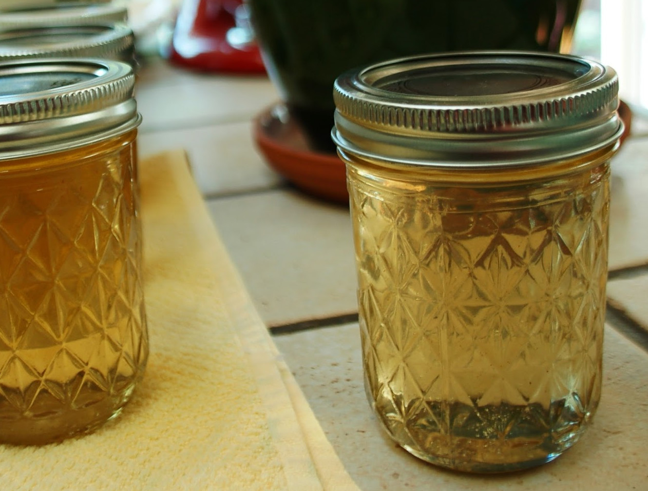 Versate subito la gelatina ancora liquida in vasi sterilizzati e chiudete come si fa al solito. Migliora, come sempre, dopo qualche settimana, ma non tanto quanto le marmellate di agrumi, quindi non vi dovete sentire in colpa a mangiarla subito.