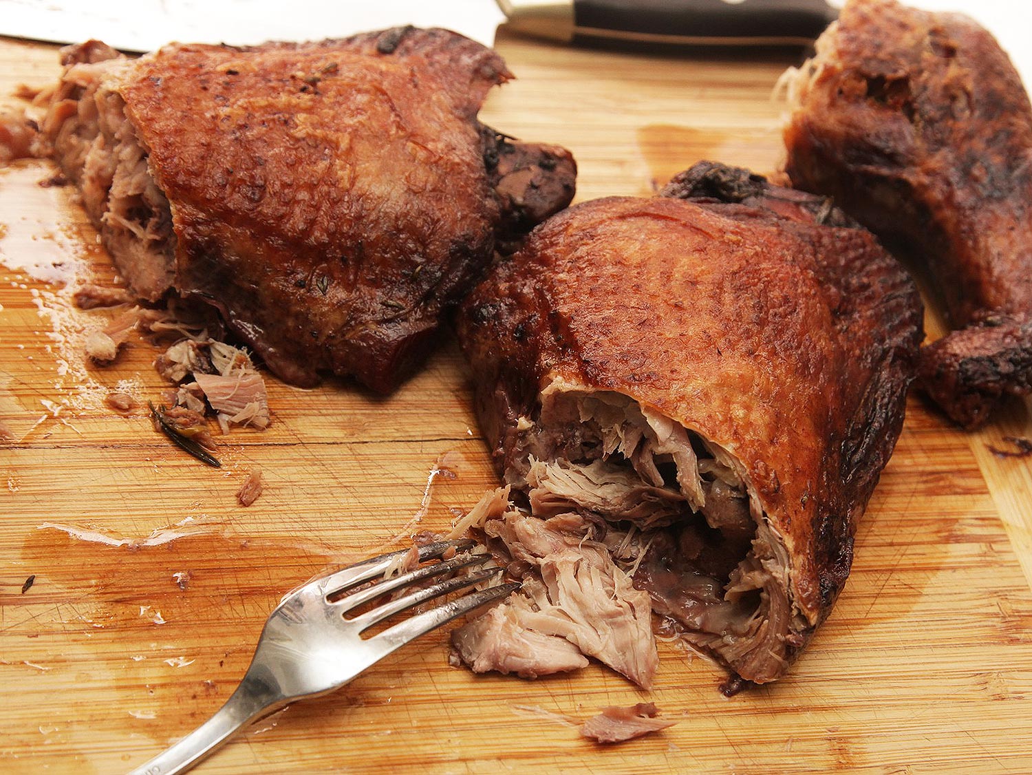 Per qualche ragione, la mia vecchia ricetta delle cosce di tacchino in umido è di gran lunga la più visitata del blog, da quando fu pubblicata ad oggi. A cinque anni di distanza, questo taglio di carne rimane tra i miei preferiti, ma ora il più delle volte preferisco cuocerlo secondo quest’altro metodo, che richiede molto meno lavoro, meno attenzione e dà un risultato che il più delle volte trovo migliore. Fatto a dovere, la pelle riesce croccantissima e la carne saporita, tenera e succulenta. Unico difetto: fa sporcare più pentolame.
