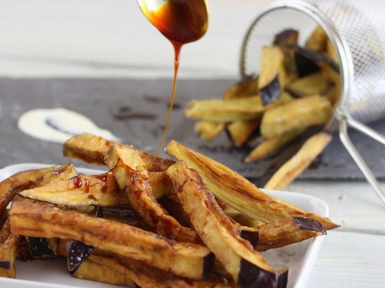 Sentendo “melanzane fritte” forse avrete in mente quelle che si usano per la caponata, la parmigiana o per la pasta alla Norma. Niente di tutto ciò: così verranno croccanti e asciutte quasi come delle buone patate fritte. Se le volete provare senza melassa o miele, sono ottime anche scondite.