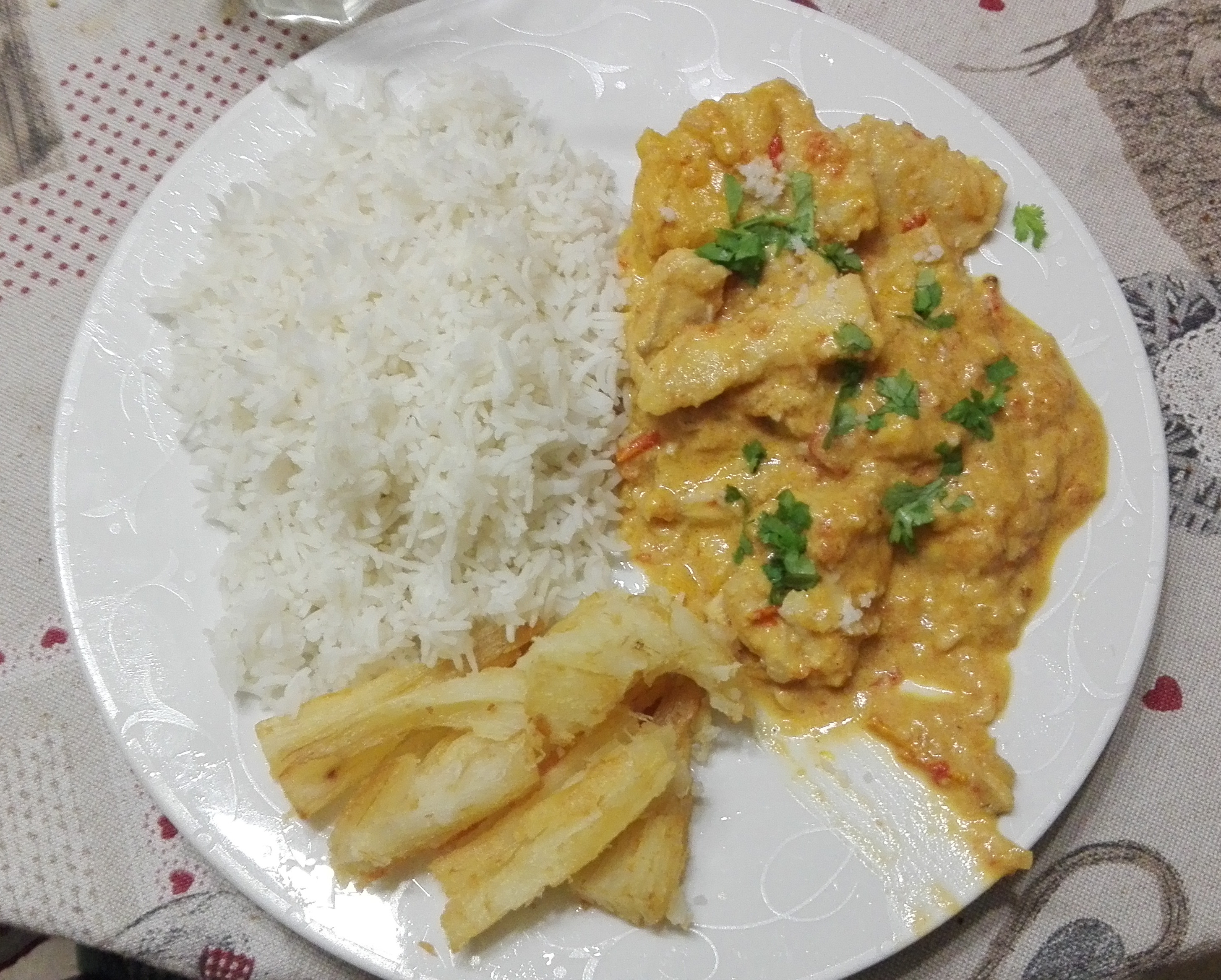 Immagine in via eccezionale non rubata, con riso bollito, manioca fritta e impiattamento altamente professionale.
