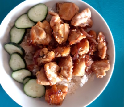Servite il pollo in una ciotola, su un letto di riso e guarnito con le fette di cetriolo crudo a lato, come nella mia pessima foto.