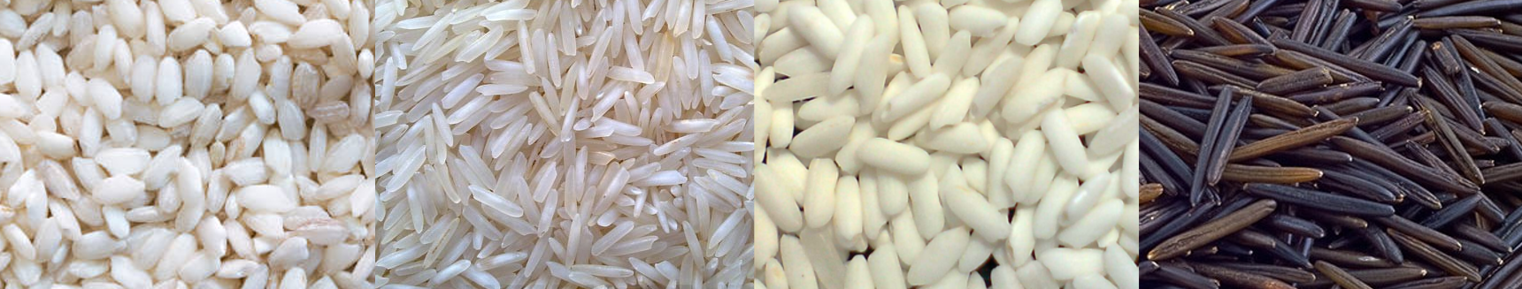 Riso arborio (var. japonica), riso basmati (var. indica), riso glutinoso (var. japonica, notare il colore bianco intenso, non trasparente), “riso selvaggio” (Zizania palustris).