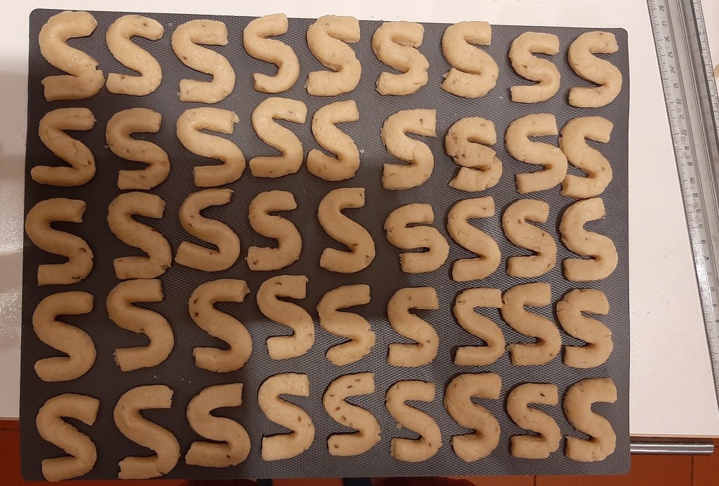 Accendete il forno a 200 °C. Se l’avete, vi consiglio di cuocere i biscotti poggiati su un foglio di silicone, che non conduce il calore quanto l’acciaio e previene il rischio di bruciare i biscotti sul fondo. Se non l’avete, metteteli biscotti ben separati sulla normale teglia, sopra ad un foglio di carta da forno, ma inseritela nella parte alta del forno, lontana dalla resistenza inferiore e voltateli spesso. Calcolate che lieviteranno, non molto, ma un po’ sì. Se non siete stati bravissimi e li avete lavorati troppo, la “S” tenderà a raddrizzarsi un po’. Controllateli spesso e cuoceteli fino a che i bordi non prendono un bel colore dorato. Ci vorranno più o meno una decina di minuti, ma è fondamentale controllarli continuamente: dicono i più ottimisti che solo alla morte non c’è rimedio, ma mi duole rilevare che anche per i biscotti ridotti in cenere il mondo terreno offre ben poche speranze. Durante questa fase, l’ammoniaca li farà lievitare: sopportate l’odore pestifero. Toglieteli dal forno e lasciateli raffreddare; nel frattempo abbassate la temperatura e lasciate che scenda fino a 150 °C. Rimettete in forno i biscotti e cuoceteli fino a che non avranno un colore uniformemente dorato. Ci vorrà circa un quarto d’ora, ma conviene voltarli e controllarli ogni due o tre minuti; ripeto, non vi fidate, i forni sono diversi, i biscotti sono diversi. Spegnete e lasciateli raffreddare, sempre in forno.