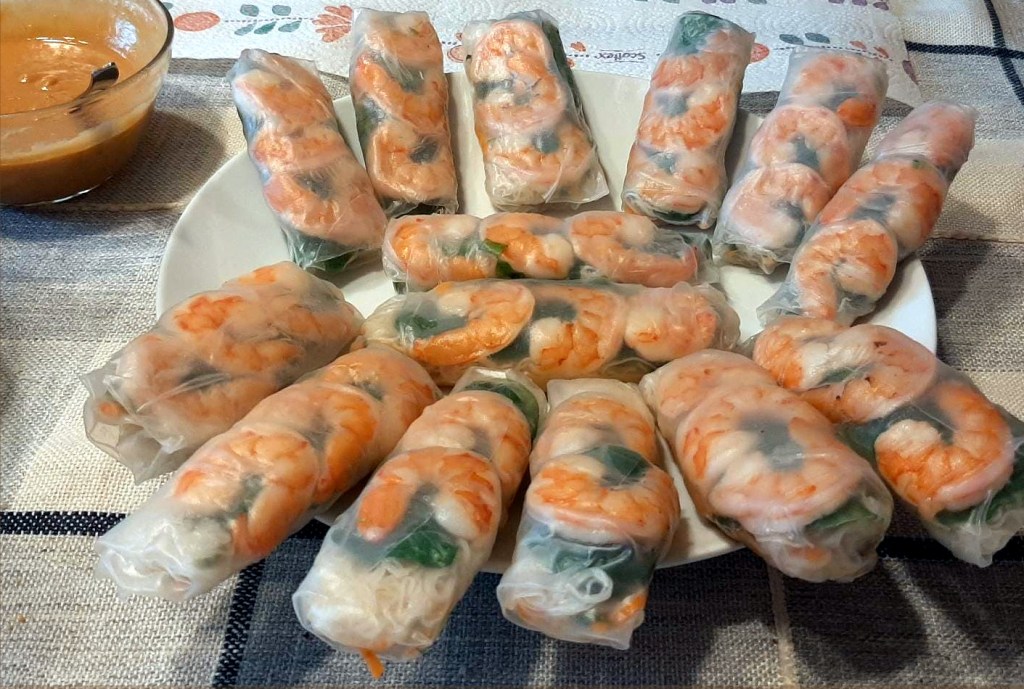 Si tratta sostanzialmente di un’insalta, di solito contenente spaghetti freddi, servita avvolta in un foglio di carta di riso, con una salsa d’accompagnamento. La carta di riso ha un nome fuorviante: non solo non ha niente a che vedere col materiale che le vecchie bretoni usano per i loro ombrelli, ma nemmeno è fatta principalmente di riso; l’ingrediente principale è la farina di manioca. Non è difficile da trovare nei supermercati forniti, almeno qui, spesso però solo in fogli di dimensioni troppo piccole per essere pratici. Cercate nei supermercati specializzati in merci estere fogli di almeno 20 cm di diametro, oppure faticate.