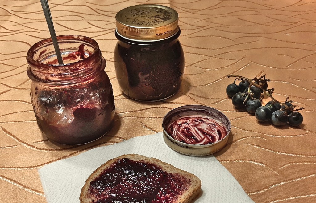 Rimettete a cuocere fate andare senza coperchio, a fuoco abbastanza basso e mescolando, fino al raggiungimento della consistenza giusta. Quando la marmellata è pronta, l’ebollizione rallenta improvvisamente e sulla superficie sembra formarsi una sorta di pelle più densa. Chi è meno esperto può affidarsi alla prova del piattino: prima di iniziare la cottura, si mette un piattino in congelatore e, quando la marmellata dà segno di essersi un po’ addensata, se ne versano su questo alcune gocce. Se, inclinandolo, il composto non scorre, la marmellata è pronta. L’uva contiene molto fruttosio, perciò non occorre più zucchero del poco che indico qui. Tra le conseguenze di questa anomala composizione c’è il fatto che non si può fidarsi del termometro per riconoscere il giusto punto di cottura, come si fa spesso in altri casi. Se voleste comunque un numero, da due prove che ho fatto la marmellata mi sembra cotta intorno a 102°C, mentre ai canonici 105–106°C diventa una gelatina durissima, che si può tagliare col coltello in cubi.