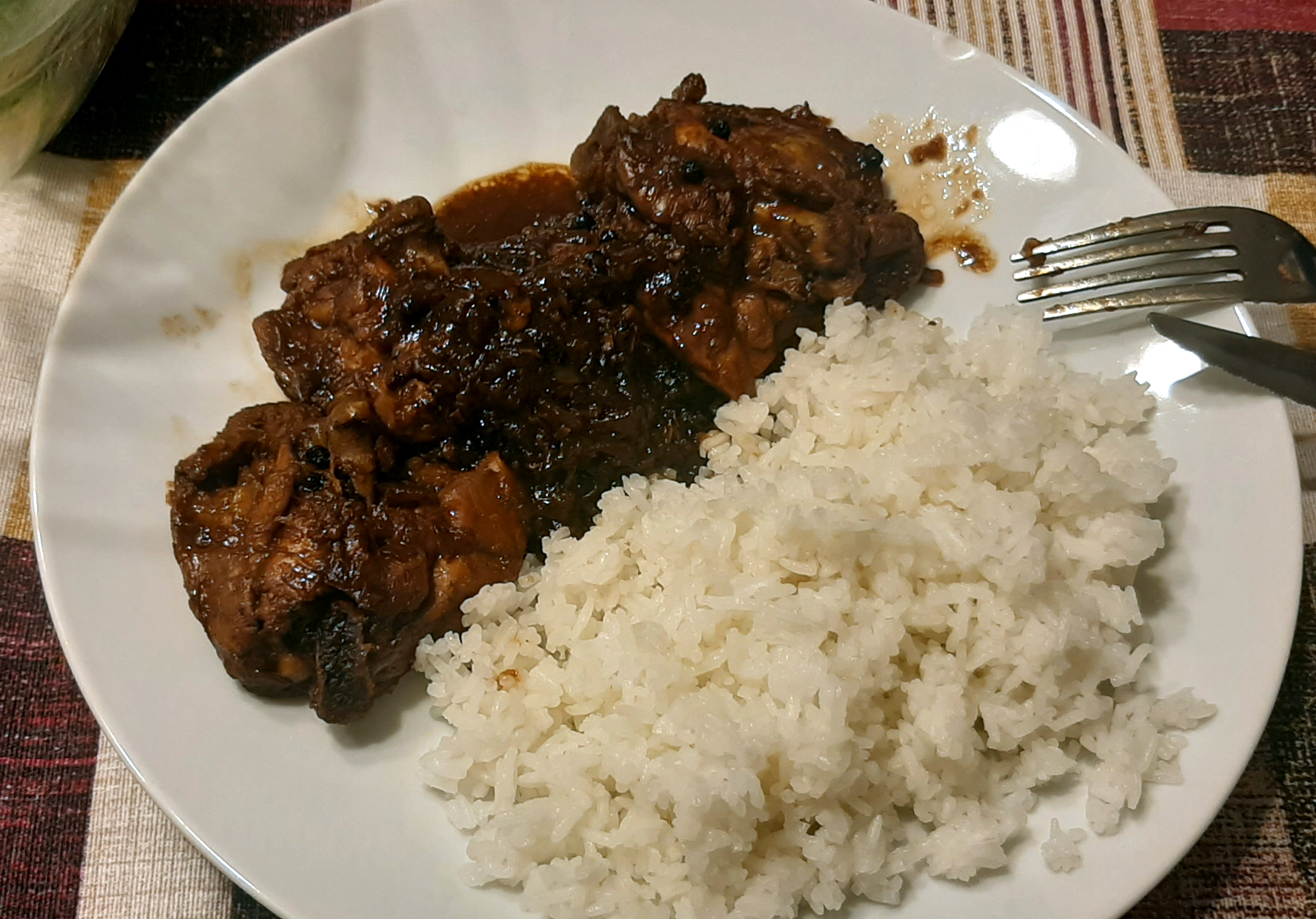 Una semplice ricetta di pollo filippina, molto saporita, con pochi ingredienti tutti facili da trovare. Questa versione contiene molto pepe nero in grani, che marinato e bollito diventa poco più piccante del pepe verde che si usa, ad esempio, per preparare il filetto di manzo. Se non vi piacesse, lo potete macinare o spezzare grossolanamente.
