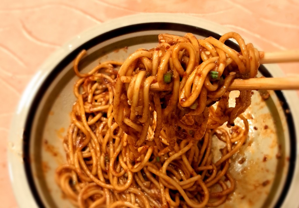 Questo piatto, originario della regione dello Shaanxi e parecchio diverso dalla versione italiana, è stato un immediato successone. Il condimento è pronto nel tempo che l’acqua bolle e chi ha una cucina un po’ varia deve ricordarsi solo di comprare un cipollotto: gli altri ingredienti fondamentali dovrebbe averli già in casa. Per chi invece vuole essere il più vicino possibile all’originale, ci sono un paio di ingredienti particolari di cui parlo o ho parlato, che si trovano nei negozi che trattano alimentari orientali oppure in rete.